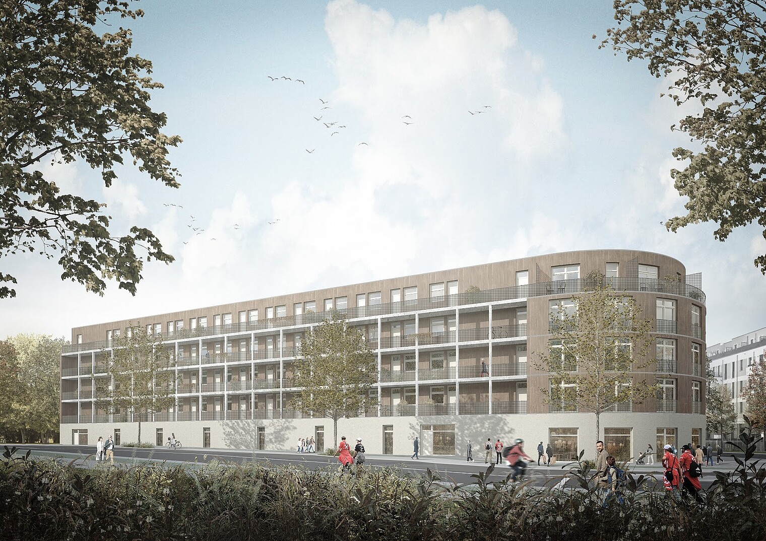 Die Gewerbefläche wird sich im Erdgeschoss eines Wohnhauses befinden. Sie wird zur Kreuzung Alte Kaulsdorfer Straße und Am Bahndamm ausgerichtet sein und eine abgerundete Front haben.
