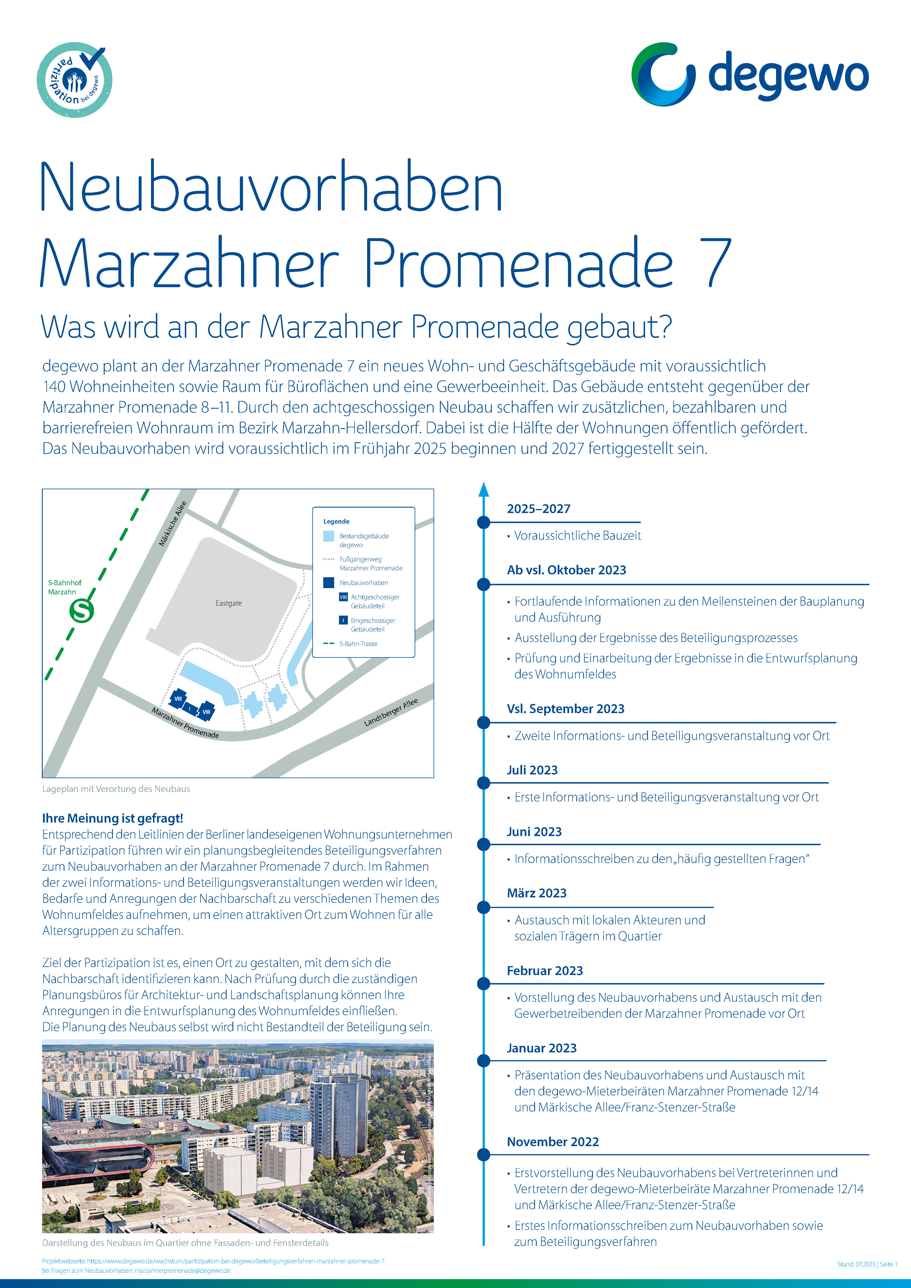 Entsprechend der Leitlinien für Partizipation im Wohnungsbau möchten wir die Anwohnenden im Umfeld der Marzahner Promenade 7 von Beginn an im Prozess des Neubauvorhabens beteiligen und über die einzelnen Schritte im Planungsprozess informieren.