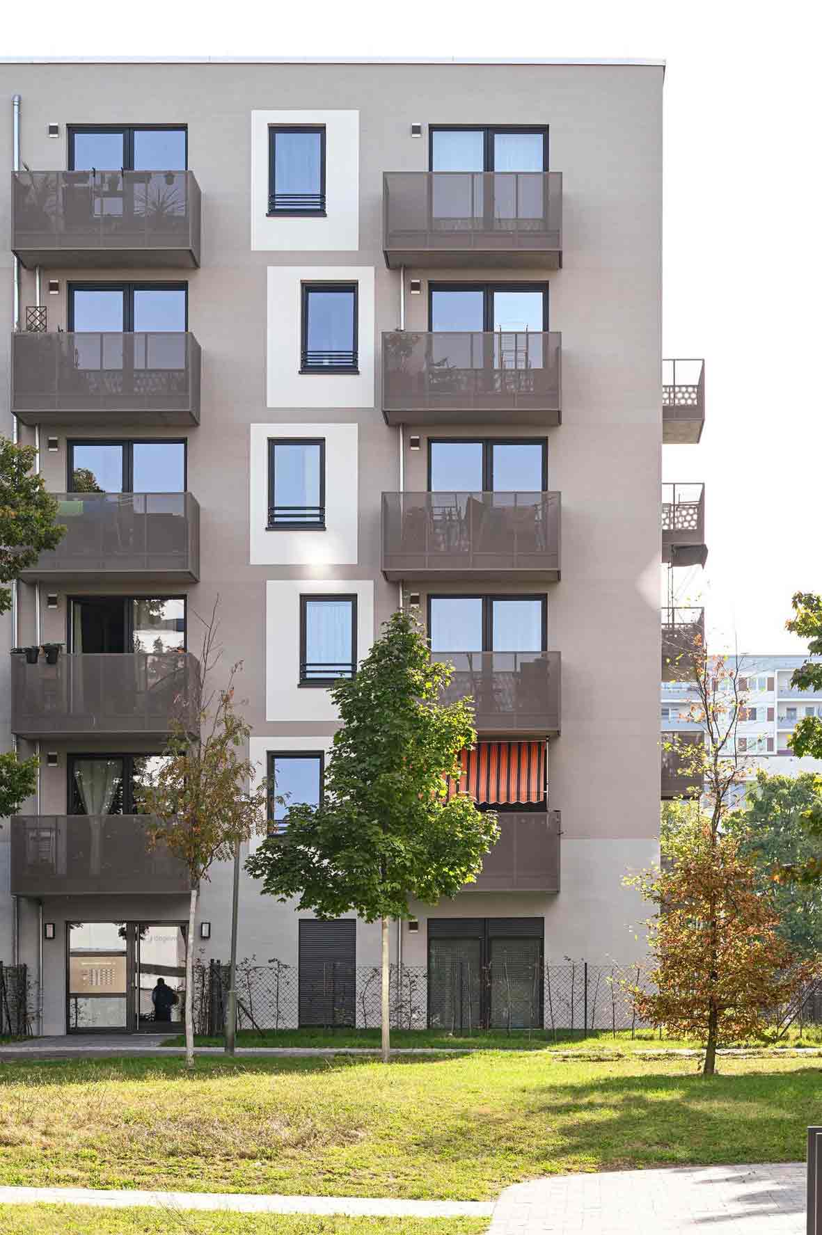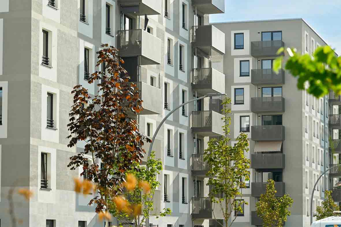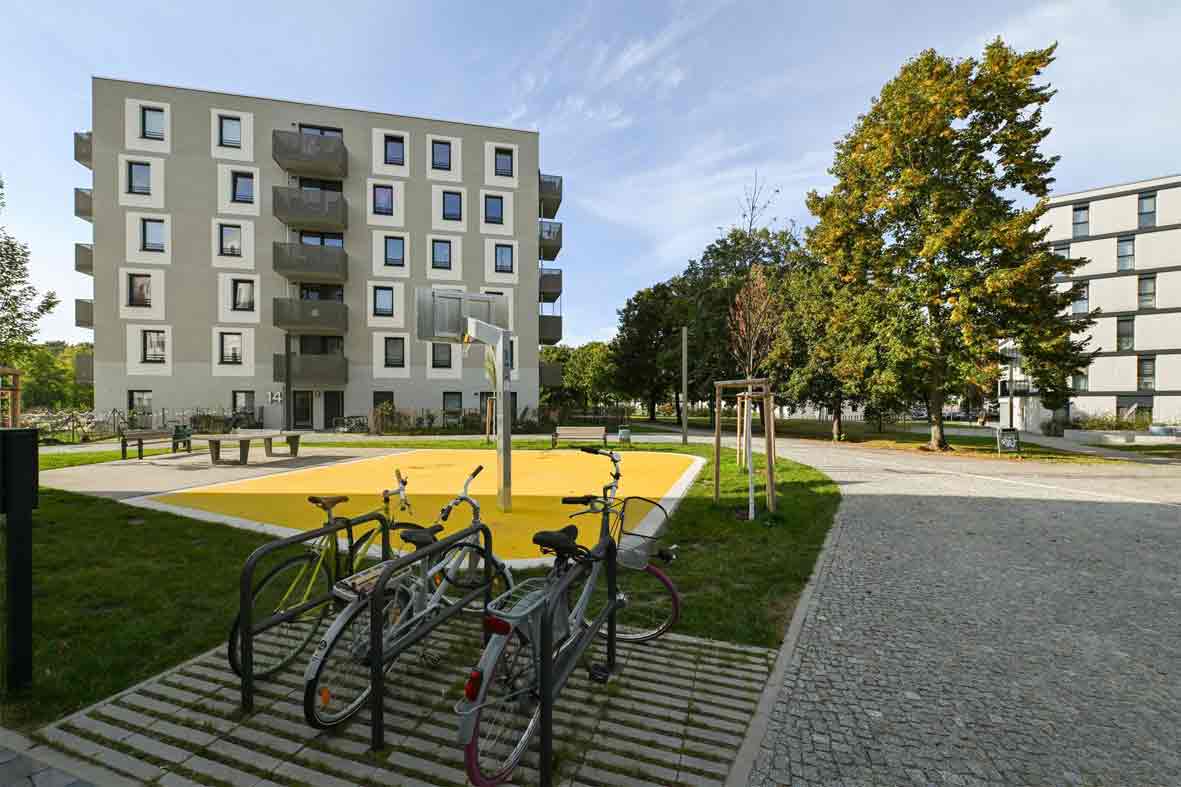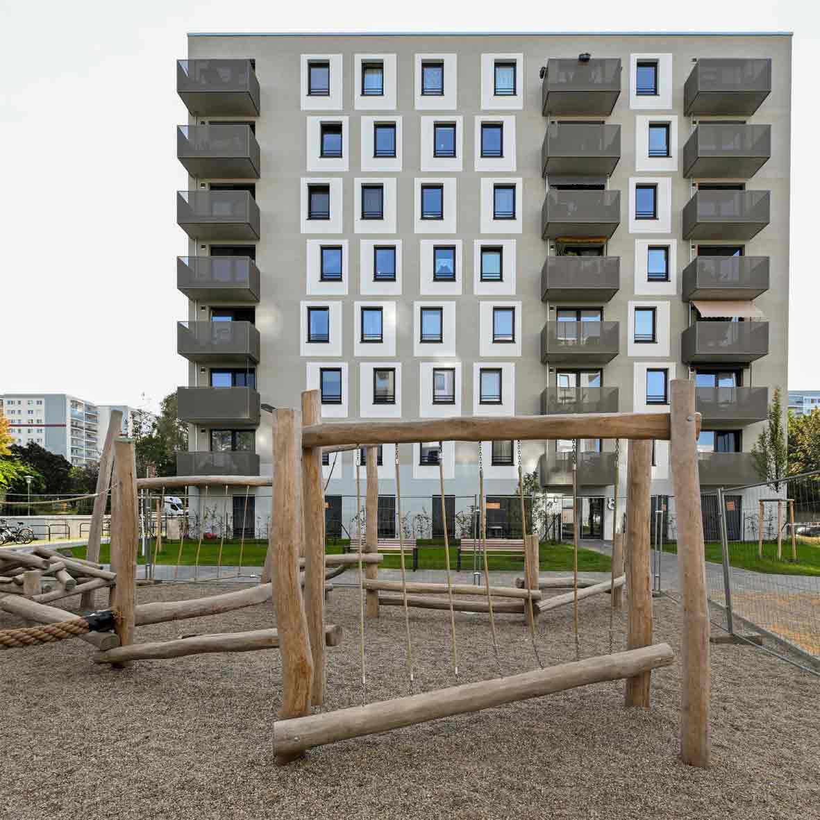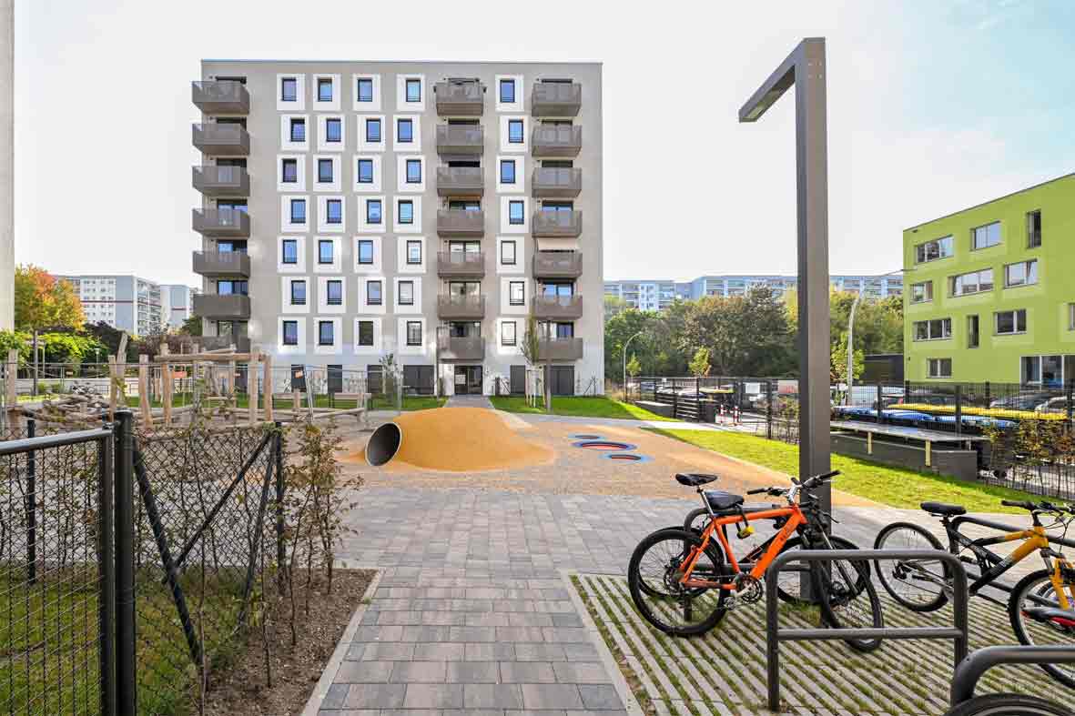 Bei dem Neubau in den südlichen Ringkolonnaden sind 180 zur Hälfte geförderte Wohnungen, drei Gewerbeeinheiten und ein Kinderspielplatz entstanden.